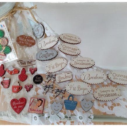 Un « petit » stock de jolis boutons… Je vais pouvoir agrémenter des ouvrages pour gâter les copines… et moi aussi !! Vacances à la neige…En ce moment, ça fait envie… Vous prendrez bien un bon chocolat chaud ? Futur projet « Noël »… Ces jolis boutons viennent de l’Atelier Bonheur du jourUne petite entreprise artisanale, familiale et française, …