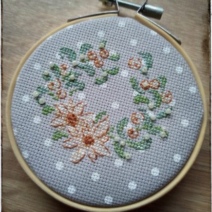 Voici ma petite couronne hivernale au point de croix, montée dans un cercle à broder.