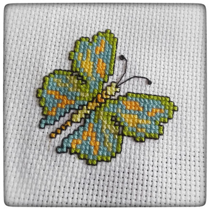 Envie de broder des couleurs cet été ! Mon choix s’est porté sur un petit ouvrage, mélange de blackwork et de couleurs vives. Un papillon s’est posé sur ma toile… (de l’aïda 7 : il y a des années que je n’avais plus brodé sur cette toile…) Un petit cadre noir Des baies …