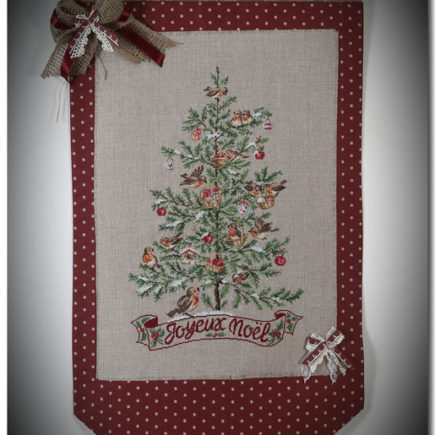 Il m’a accompagnée pendant toute l’année, ce joli sapin au point de croix. Je vous présente aujourd’hui le montage que j’en ai fait. Des p’tits noeuds, de la toile de jute, un joli tissu à pois… Et voilà !!! Broderie : modèle de Véronique Enginger pour Les Brodeuses parisiennes JOYEUX NOËL à …