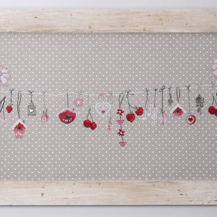 Je ne vous avais pas montré mon Wilkommen encadré… Il a pris place dans mon atelier… Modèle « Wilkommen » de UB Designs Etamine à pois Murano Zweigart Fils Rosace et Panda Breloques de mes tiroirs Cadre by papounet chéri !!!